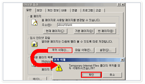 ¨è [ÀÎÅͳݿɼÇ]¿¡¼ [ÀϹÝ]-[ÀÓ½ÃÀÎÅÍ³ÝÆÄÀÏ]-[ÄíŰ»èÁ¦]¹öưÀ» Ŭ¸¯Çϰí [È®ÀÎ]¹öưÀ» ´©·ì´Ï´Ù.