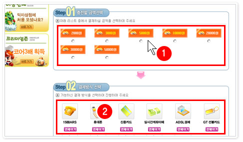 ij½¬ ÃæÀü ¸Þ´ºÁß ÃæÀüÇϰíÀÚ ÇÏ´Â ±Ý¾×À» ¼±Åà ÇÕ´Ï´Ù. GT¼±ºÒÄ«µå·Î´Â 3,000¿ø, 5,000¿ø, 10,000¿ø ´ÜÀ§·Î ÃæÀüÀÌ °¡´ÉÇÕ´Ï´Ù. ARS, ÈÞ´ëÆù, ½Å¿ëÄ«µå, °èÁÂÀÌü, ADSL, µµ¼¹®È»óǰ±Ç, µµ¼»ýȰ±ÇÀÇ °æ¿ì 1ȸ 3,000¿ø ºÎÅÍ 50,000¿ø ±îÁö ¿øÇϽô ±Ý¾×À¸·Î ÃæÀüÀÌ °¡´ÉÇÕ´Ï´Ù. ´Ü, ¹®È»óǰ±Ç ¹× µµ¼»ýȰ±ÇÀº "½ºÅ©·¡Ä¡" °¡ ÀÖ´Â ÀÎÅÍ³Ý °â¿ë »óǰ±Ç¸¸ »ç¿ëÀÌ °¡´ÉÇÕ´Ï´Ù. |